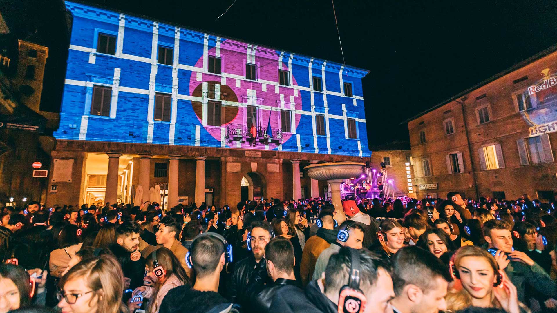 Ideazione di un percorso didattico formativo propedeutico alla progettazione e realizzazione di una performance di live video mapping a cura di di studenti coordinati e supervisionati da Antica Proietteria e Isia Urbino esibito il 9 Maggio in occasione della serata Red Bull LightArts – Silent Disco Urbino 2019